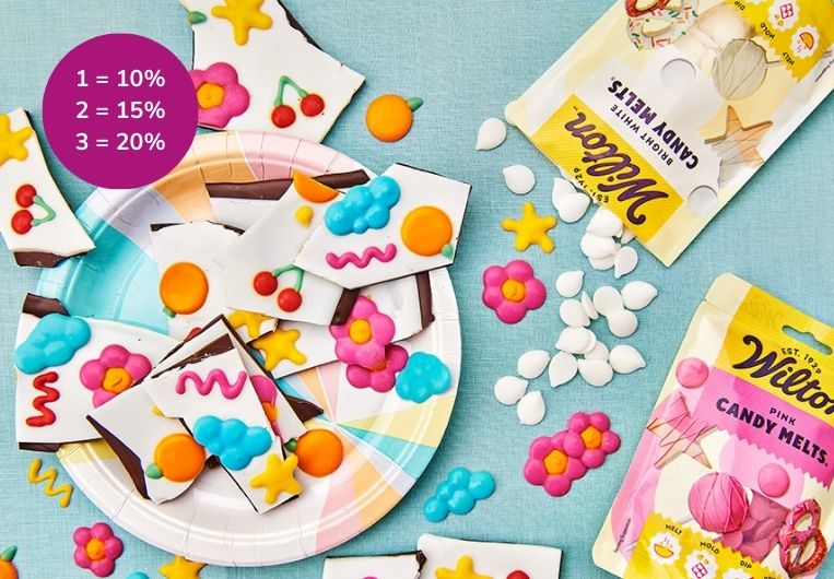 Makkelijk je baksels een kleurrijke en feestelijke finishing touch geven? Met Candy Melts maak je in een handomdraai de mooiste dripcakes, swirls en decoraties. T/m 16 januari profiteer je van oplopende korting op Candy Melts: 10% bij 1 product, 15% bij 2 producten en 20% bij 3 producten.