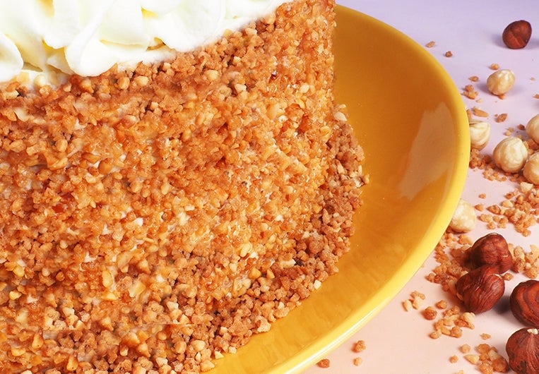 Strooi een royale hoeveelheid nougatine over je taart voor een krokante afwerking.